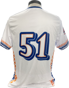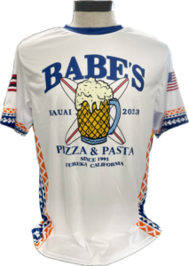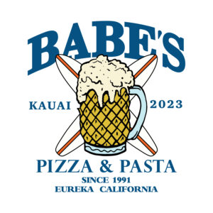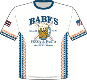 Babe’s Pizza & Pasta, located in Eureka, CA, required an iteration of their previous jersey for their baseball league’s Kauai Tournament in 2023. The client requested a transformation of their original beer mug into a pineapple beer mug, with surfboards behind it. The jerseys were then sublimated with tribal patterns and flags to accompany the main graphic on the front.
