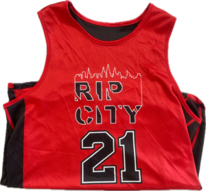 A sublimated team jersey and shorts designed for the Rip City Basketball team in Medford, Oregon. The client provided a rough sketch and requested a fast turnaround to ensure all items were decorated on time for their first tournament.